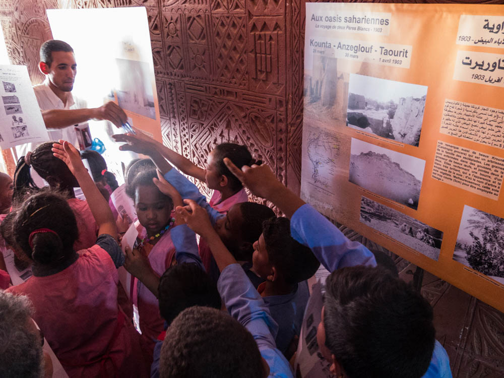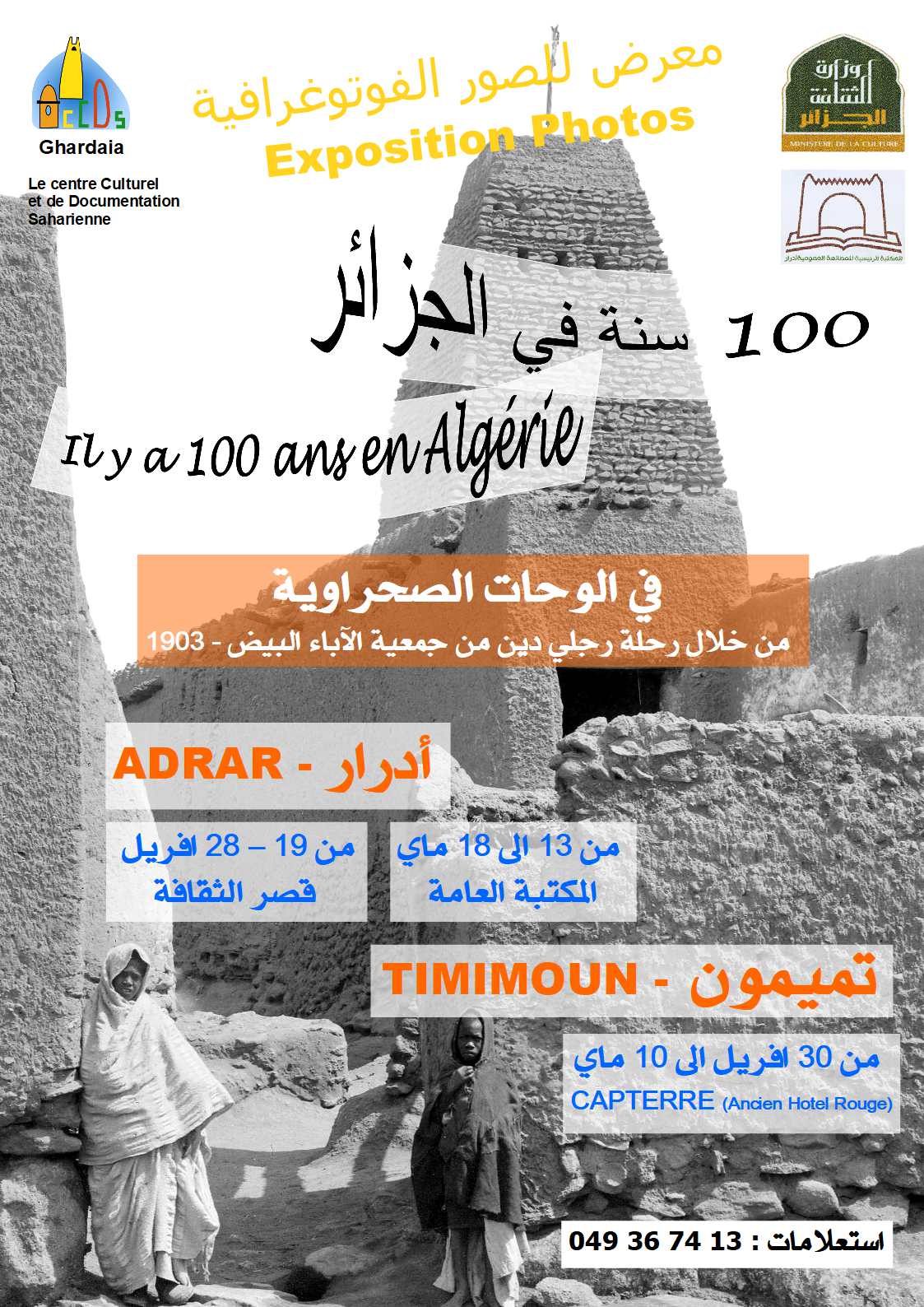 Cette exposition est organisée, après accord avec le Ministère de la Culture, avec le Directeur de la Bibliothèque générale d'Adrar. Elle s'est déroulée en trois étapes dans trois lieux différents (deux à Adrar et un à Timimoun). Le thème principal de cette exposition traite du Voyage de deux Pères Blancs aux Oasis sahariennes en 1903.
